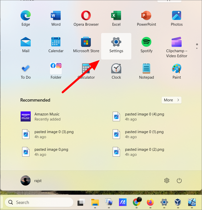 Step 1: Click the 'Start' button and select 'Settings' to open the Settings app.