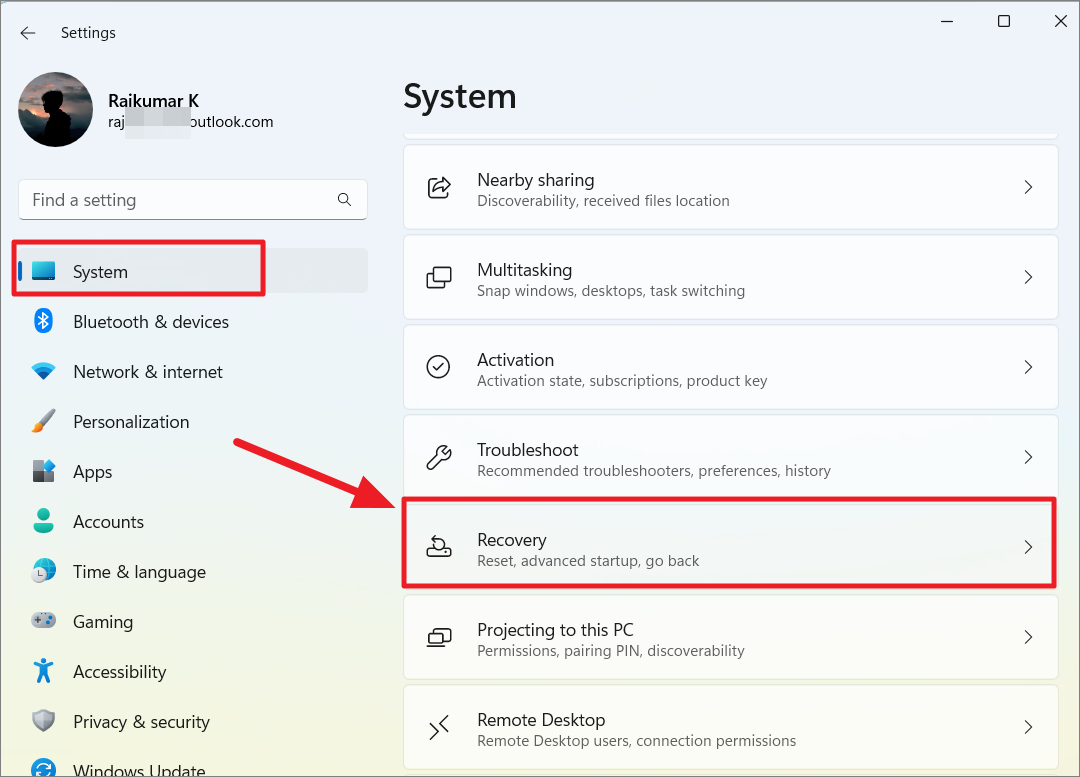 Step 2: In the Settings app, select 'System' from the left pane, scroll down, and click on 'Recovery' on the right.