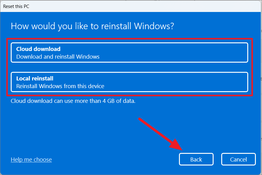 - Cloud download: Downloads a fresh copy of Windows 11 from Microsoft's servers (requires an internet connection and approximately 4 GB of data).