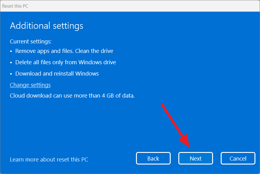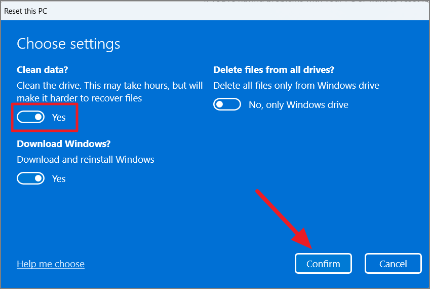 - Enable 'Clean data' to thoroughly erase your drive (recommended if you're disposing of or selling your PC).
