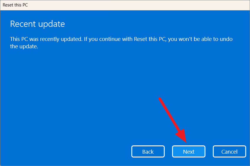 Step 9: If prompted about recent updates not being removed, click 'Next' to proceed.