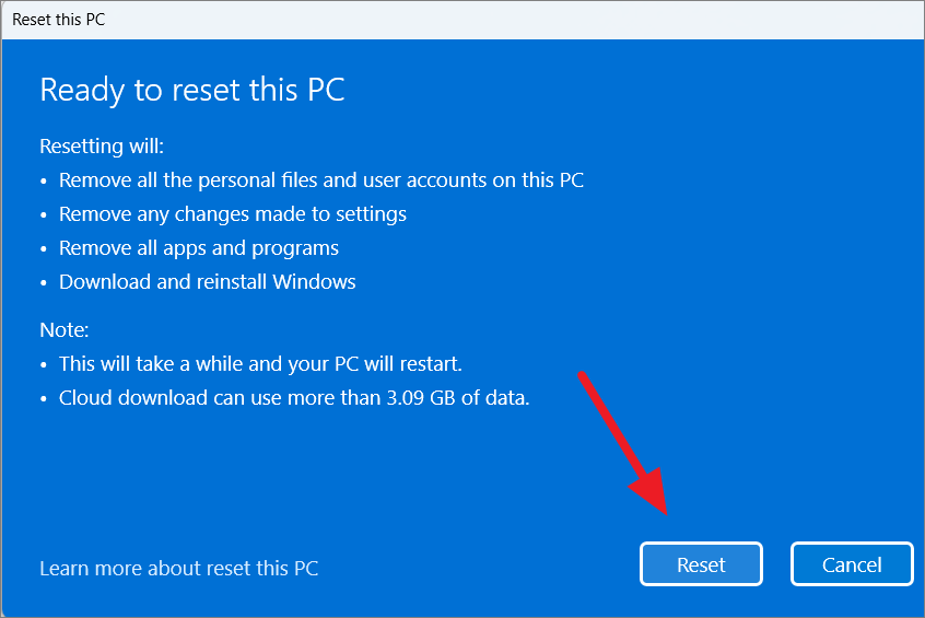 Step 7: Click 'Reset' to begin the process. Your PC will reinstall Windows 11, which may take some time.