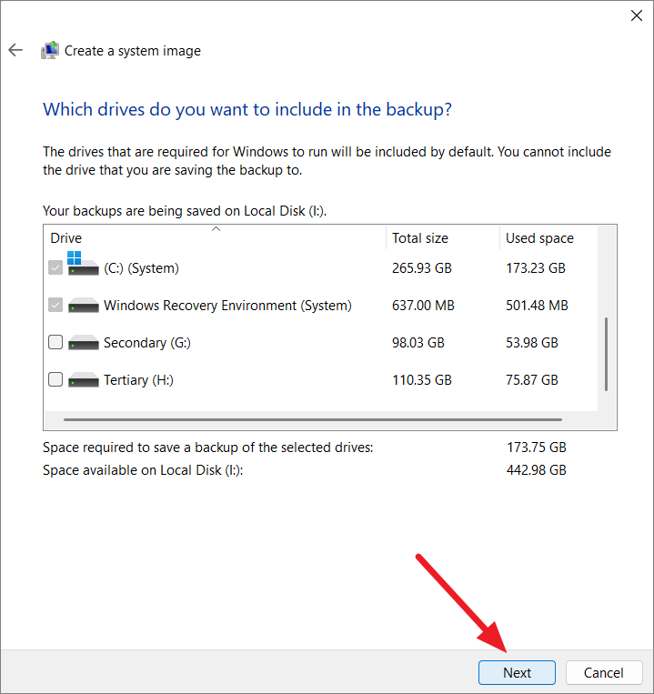 Step 5: By default, the system drive, Windows Recovery Environment, and EFI partition are selected. Click 'Next' to proceed.