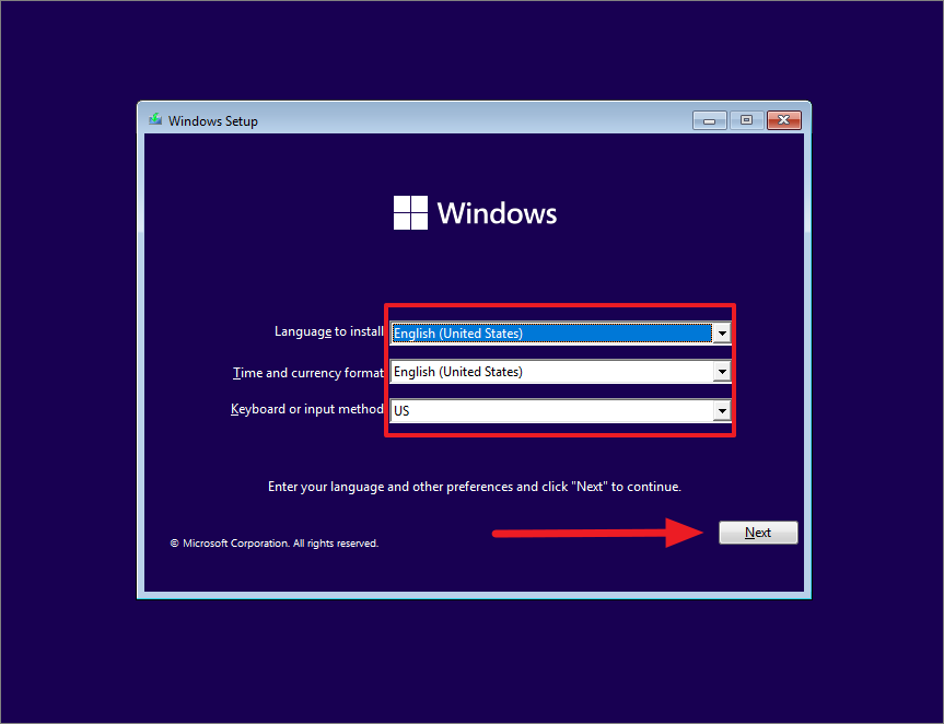 Step 3: The Windows Setup will load. Choose your language, time and currency format, and keyboard layout, then click 'Next'.