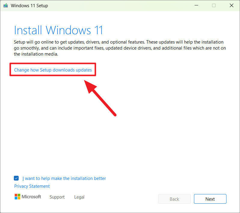 Step 2: In the Windows Setup window, click 'Change how Setup downloads updates'.