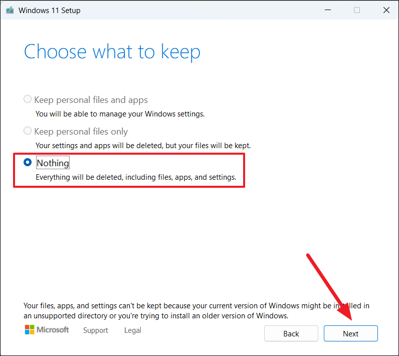 - Nothing: Removes everything for a clean install.