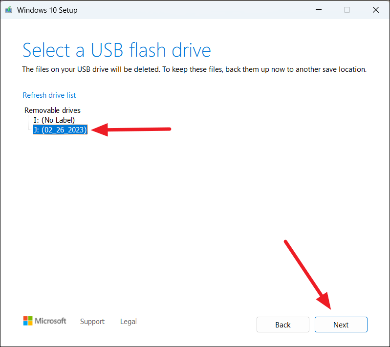 Step 6: If selecting 'USB flash drive', choose your USB drive from the list and click 'Next'. This process will erase the drive's contents.