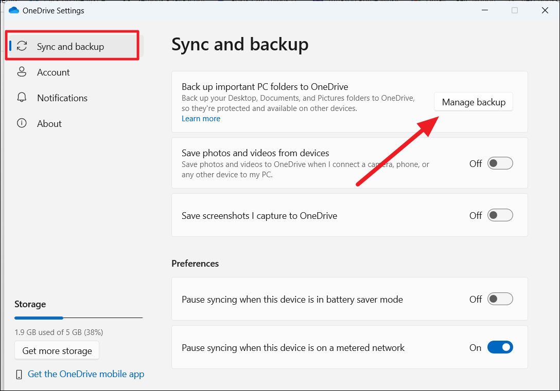 Step 3: Navigate to the 'Sync and backup' tab, then click 'Manage backup' on the right.