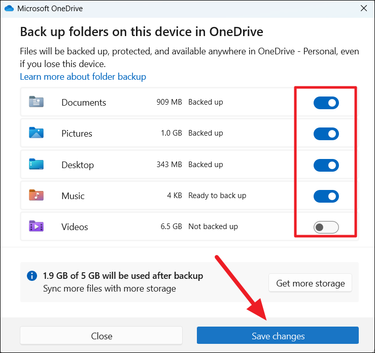 Step 4: Toggle on the switches for the folders you want to back up, such as 'Desktop', 'Documents', 'Pictures', 'Music', and 'Videos'.