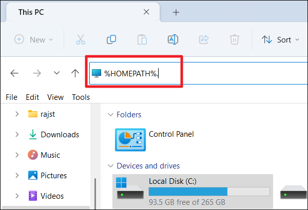 Step 2: Open File Explorer and type %HOMEPATH% in the address bar to access your user profile directory.