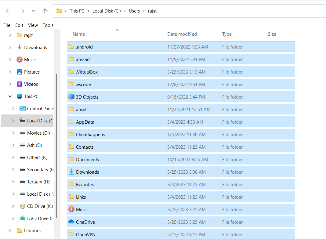 Step 3: Press Ctrl + A to select all folders, or manually select the ones you wish to back up.