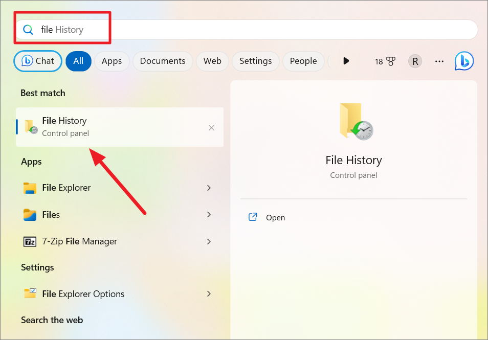 Step 1: Click the Start button, type File History, and select the 'File History' Control Panel option.