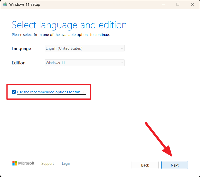Step 4: Select the language and edition of Windows 11. Uncheck 'Use the recommended options for this PC' if you need to change them. Click 'Next'.