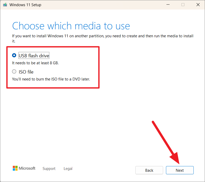 Step 5: Choose 'USB flash drive' or 'ISO file' as your media type. For a USB drive, ensure it has at least 8 GB of space.