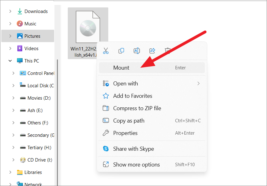 Step 1: Right-click the downloaded ISO file (e.g., 'Win11_22H2_English_x64v1.iso') and select 'Mount'.