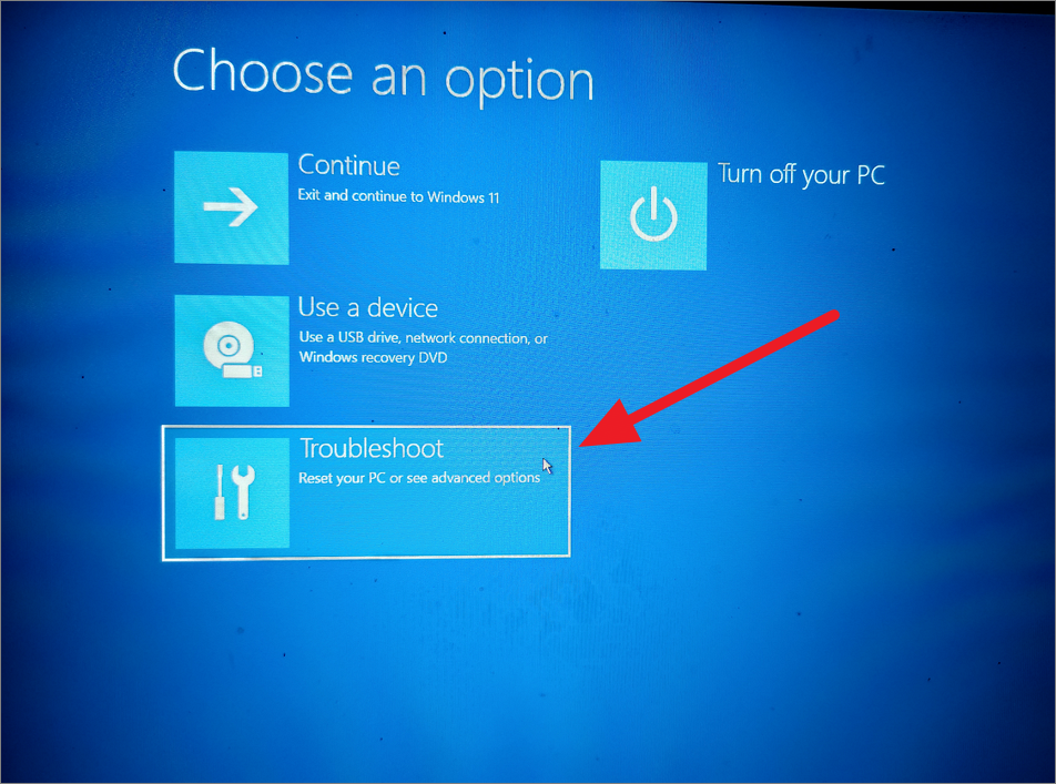 Step 2: In the Recovery Environment, select 'Troubleshoot'.