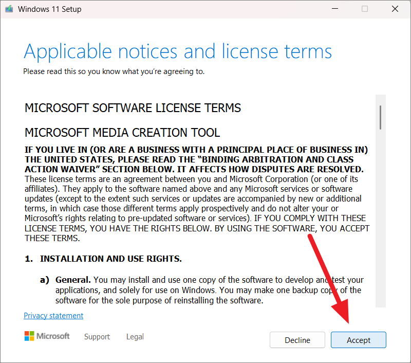 Run the downloaded 'mediacreationtool.exe' file. Accept the license terms to proceed.