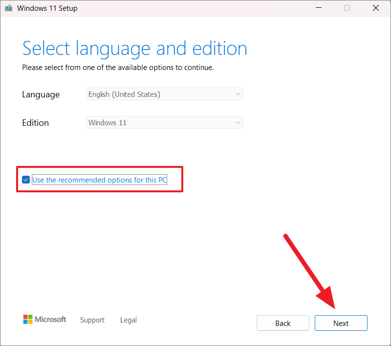Uncheck 'Use the recommended options for this PC' if you wish to change the language, then click 'Next'.