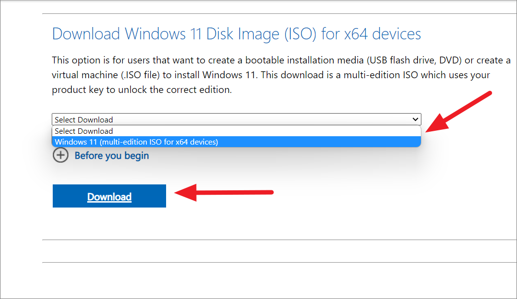 Visit the official Windows 11 download page. Under the "Download Windows 11 Disk Image (ISO)" section, select 'Windows 11 (multi-edition ISO for x64 devices)' from the dropdown menu.