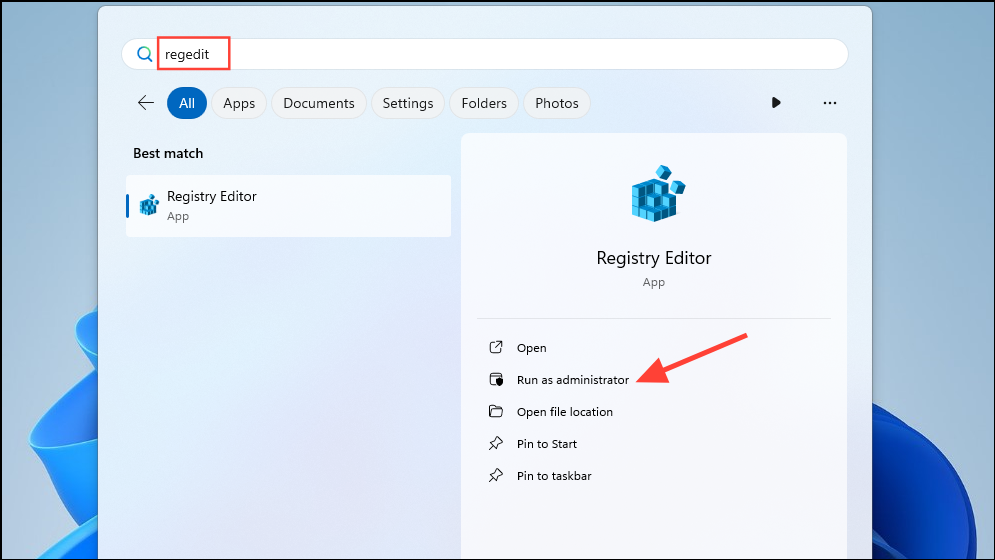 regedit, and click on 'Run as administrator'.