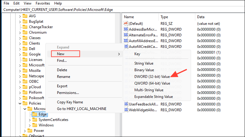 - With the Edge directory selected, right-click on the right side and select 'New' and then 'DWORD (32-Bit) Value.