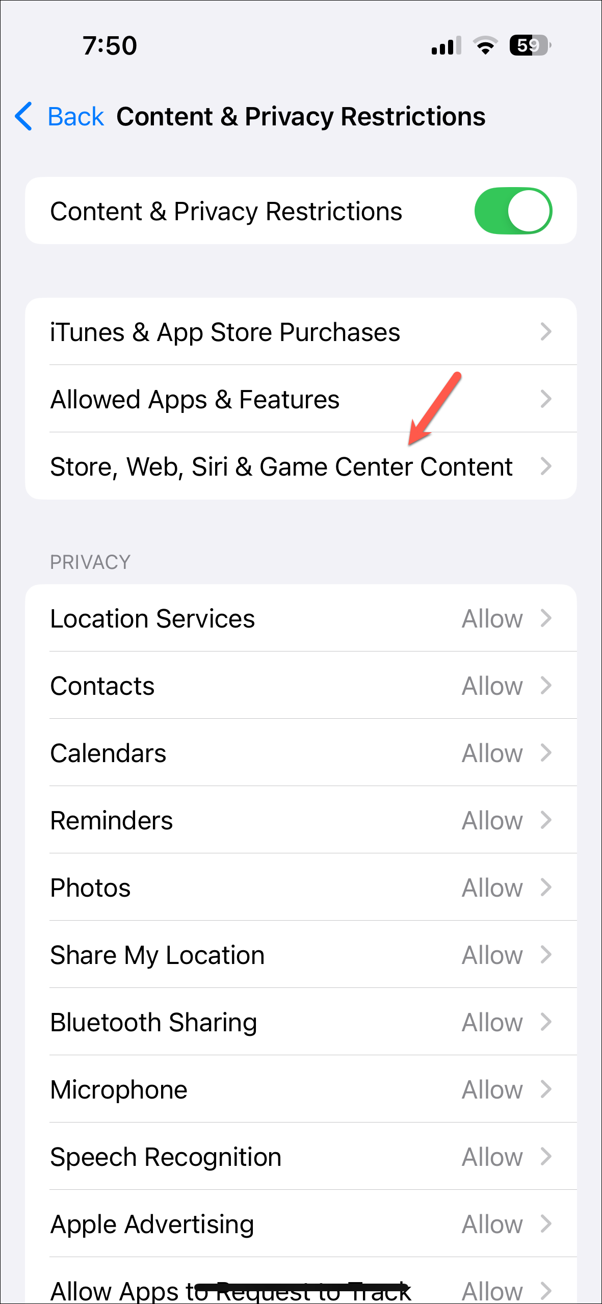 - Tap on the toggle for 'Content & Privacy Restrictions' at the top if it is not enabled. Then, go to 'Store, Web, Siri & Game Center Content'.