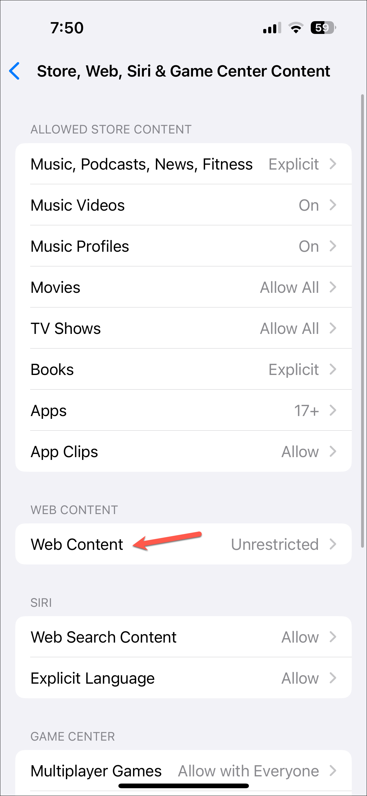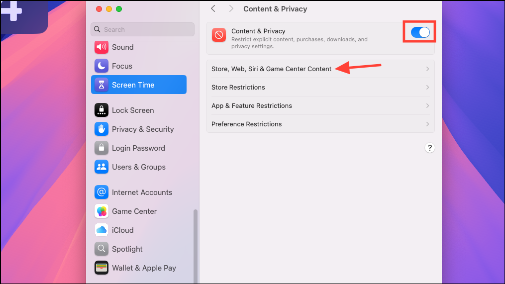 - Now, click on the 'Store, Web, Siri, & Game Center Content' option.