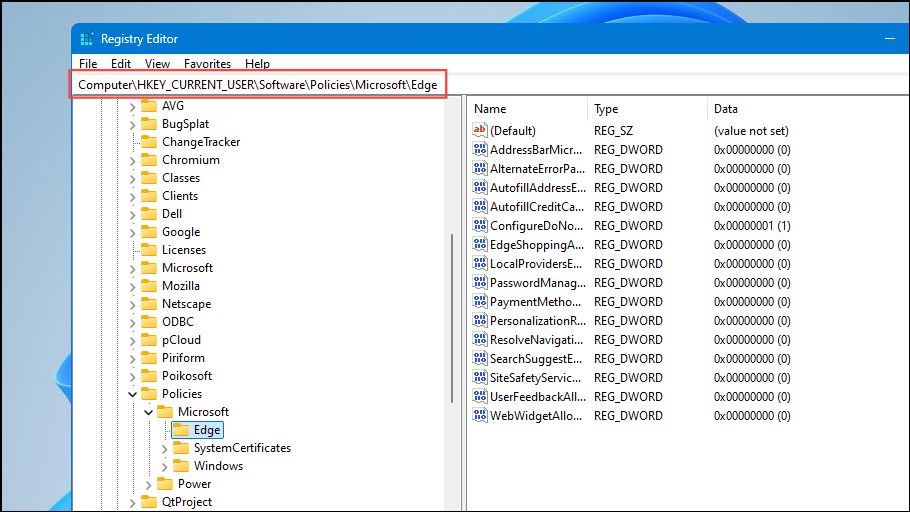 HKEY_CURRENT_USER > Software > Policies > Microsoft > Edge.