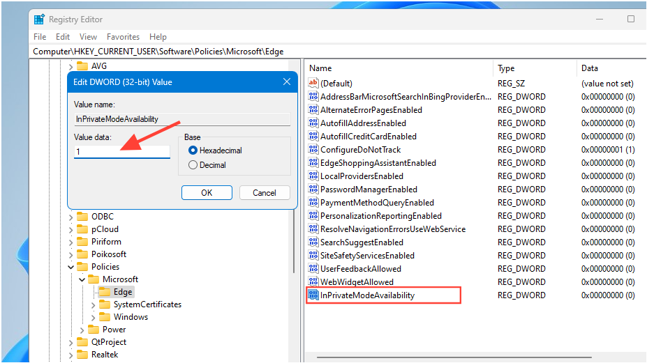 InPrivateModeAvailabilityand then double-click on it and set its value to1.