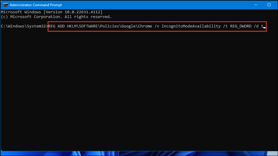 REG ADD HKLM\SOFTWARE\Policies\Google\Chrome /v IncognitoModeAvailability /t REG_DWORD /d 0. Make sure to replace the1with0.