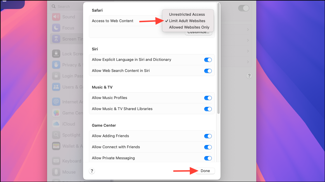 - For the 'Access to Web Content' option under Safari, select 'Limit Adult Websites' from the menu and tap on 'Done' in the bottom right.