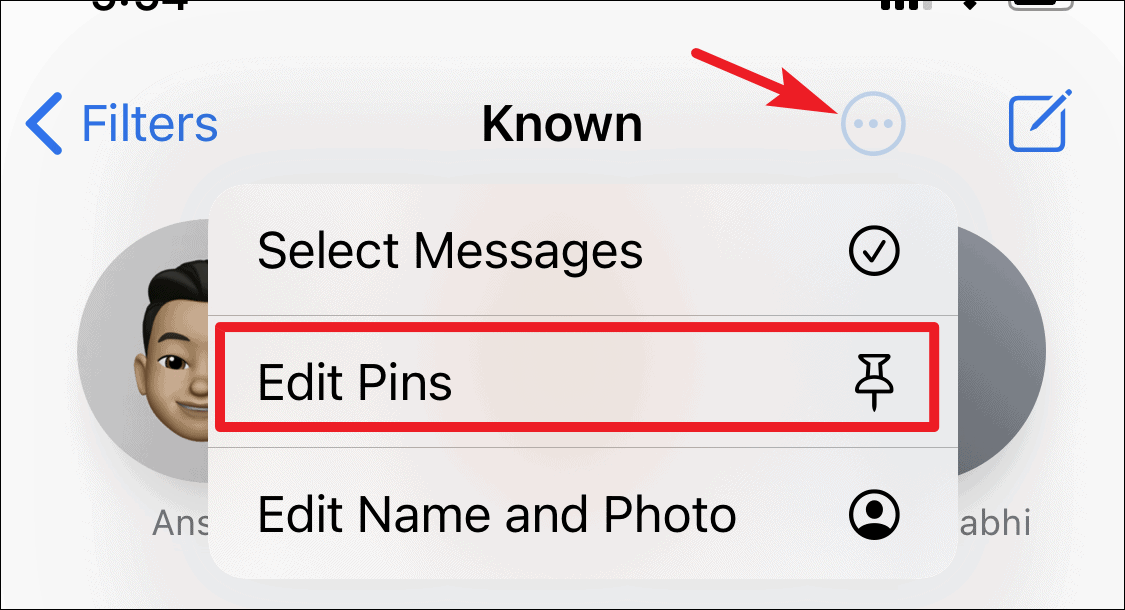 To unpin a contact at any time, either drag them down or tap on ‘More options’ (three dots) towards the upper right corner of the screen and select ‘Edit Pins’ from the options that appear.