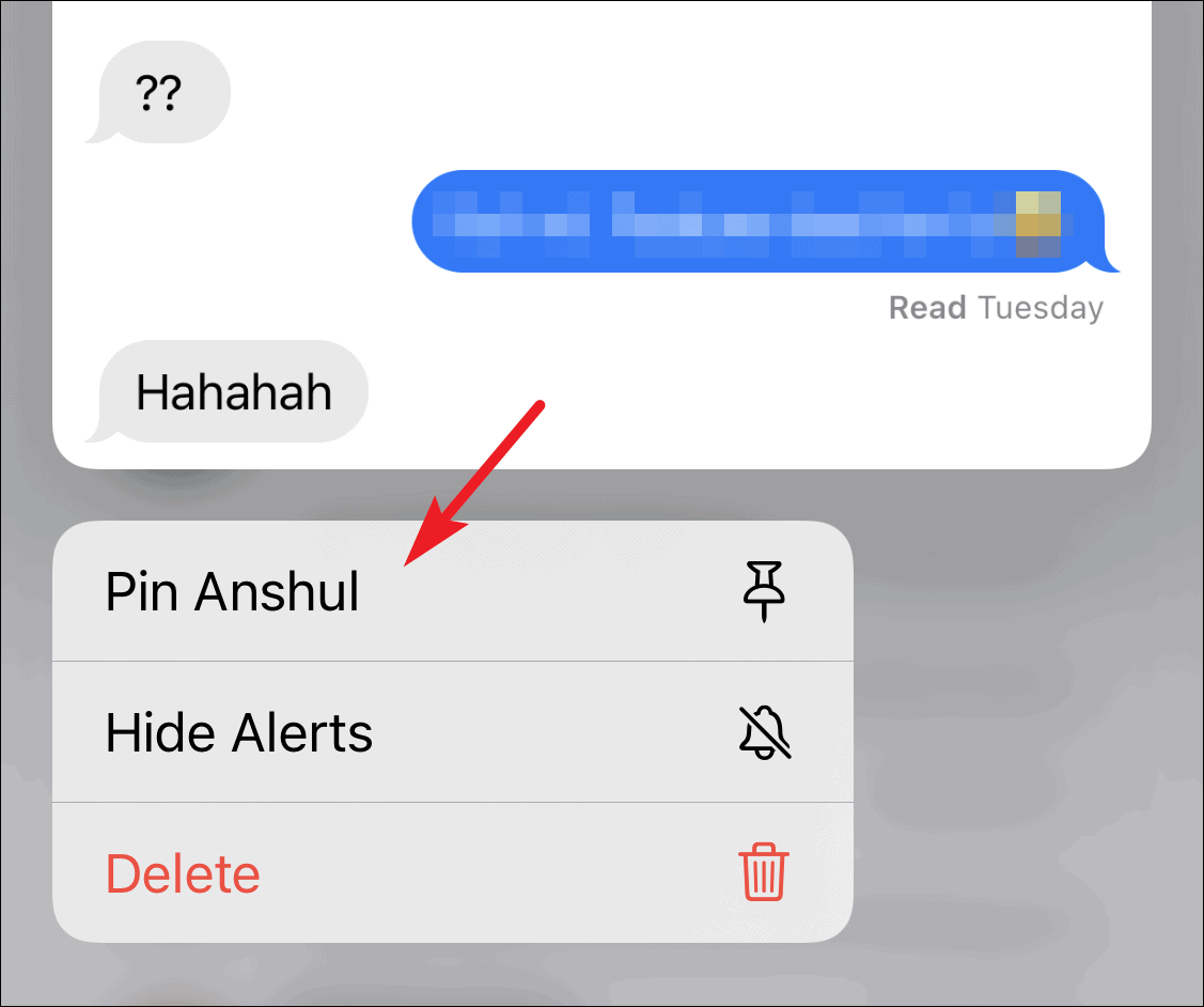 To pin a conversation in Messages, tap and hold the conversation you want to pin. A message preview screen will appear. Tap on the ‘Pin [NAME]’ option below the preview.