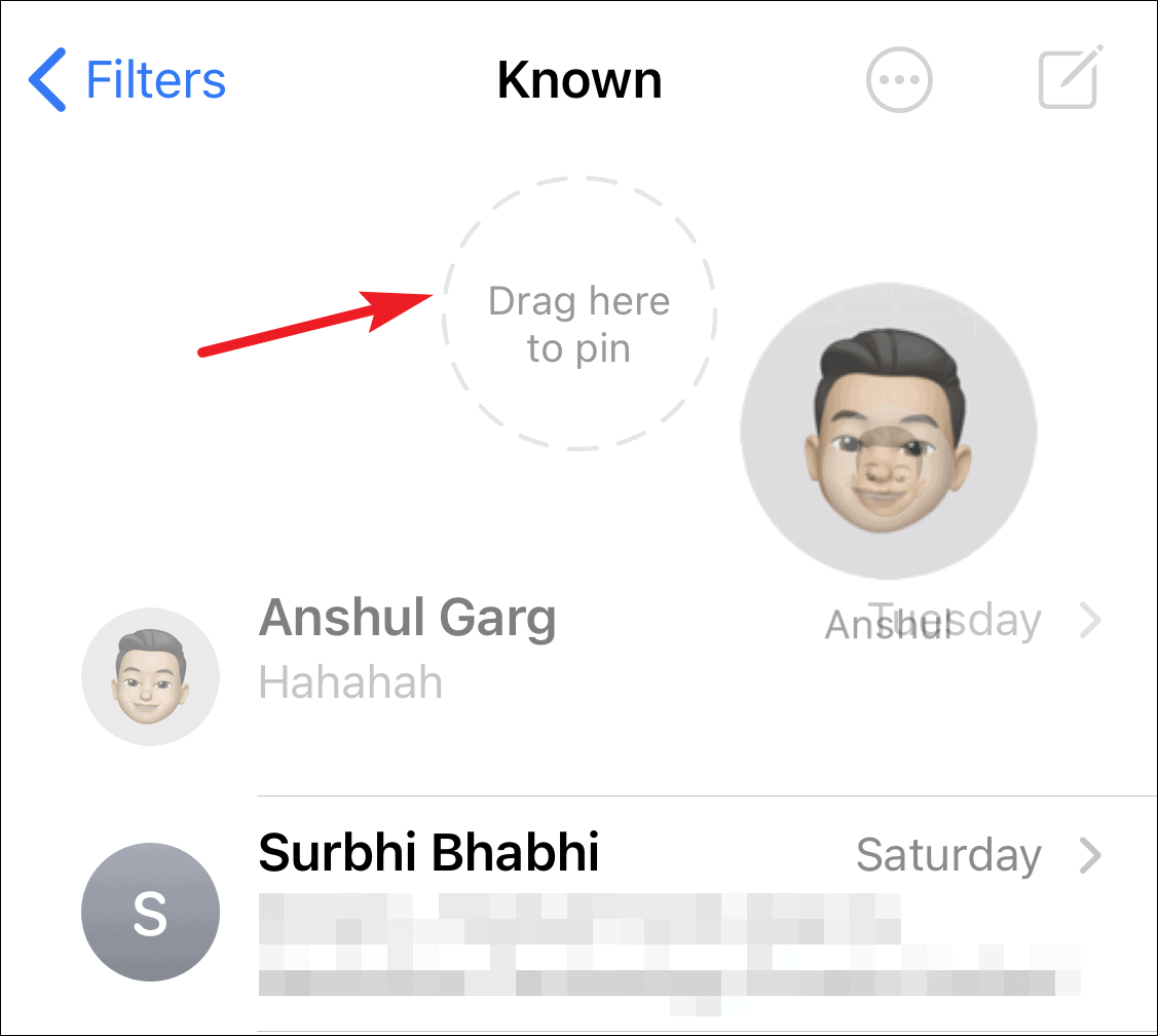 If the conversation you want to Pin is not too down on the list, you can also drag and drop to pin it. Tap and hold the conversation and drag it towards the top to pin it. You’ll see a ‘Drag here to pin’ label. Drop the floating avatar in the area.