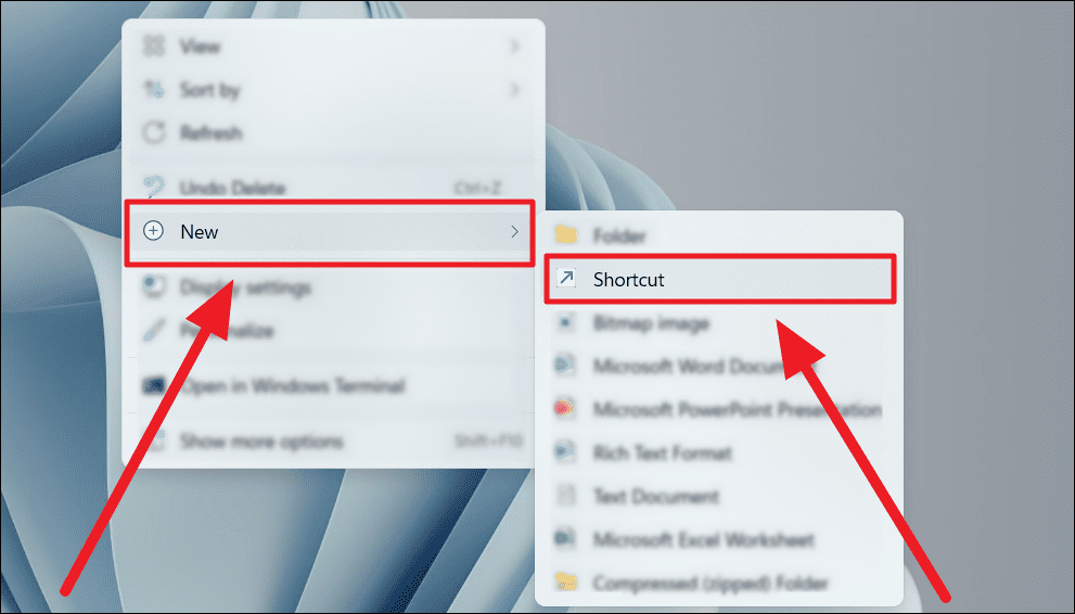 Step 1: Right-click on an empty space on your desktop, hover over New, and select Shortcut from the submenu.