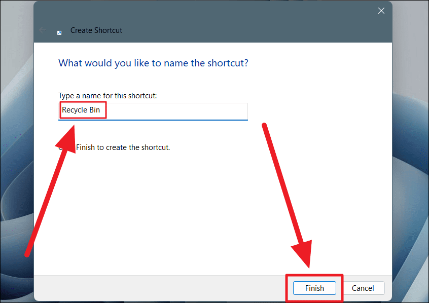 Step 3: Enter Recycle Bin as the name for this shortcut in the 'Type a name for this shortcut' field, and click on Finish.