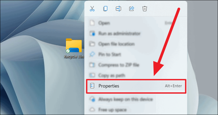 Step 4: Right-click on the new 'Recycle Bin' shortcut on your desktop and select Properties from the context menu.