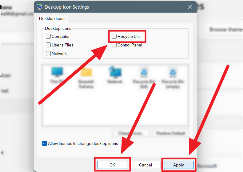 Step 4: In the 'Desktop Icon Settings' window, uncheck the box next to Recycle Bin.