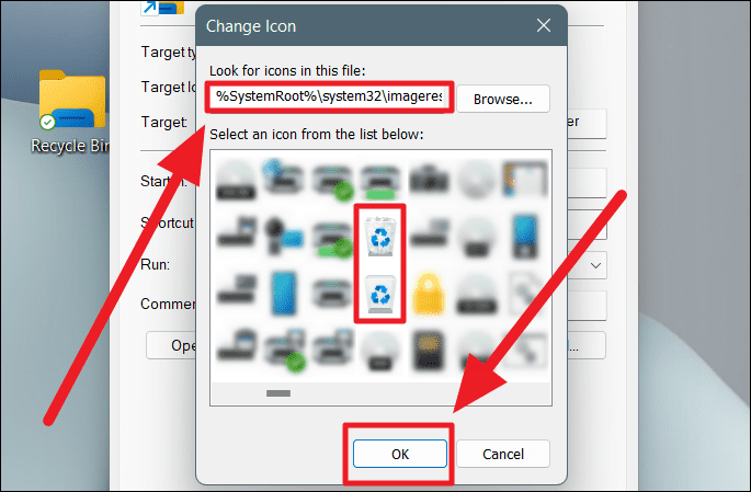 Step 7: Scroll through the list of icons until you find the Recycle Bin icons. There should be two versions: one empty and one filled. Select the icon you prefer and click OK.