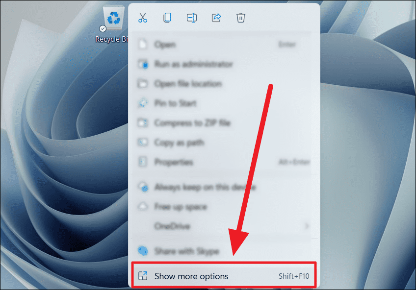 Step 9: Right-click on the 'Recycle Bin' shortcut and select Show more options.