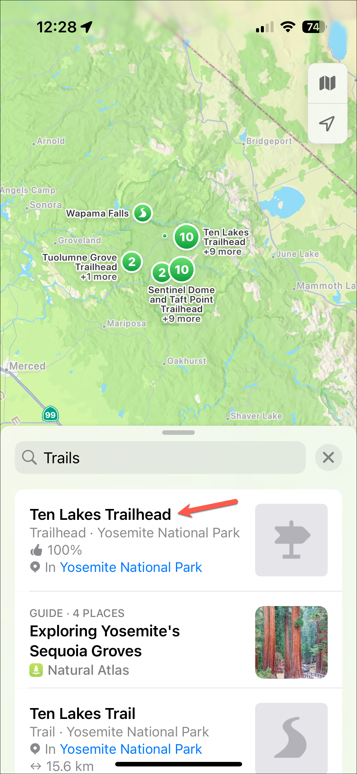 - For Yosemite, we have 4 options, including one for 'Trails'. For others, there can be another option 'Trailheads' as well. Tap on 'Trails'.