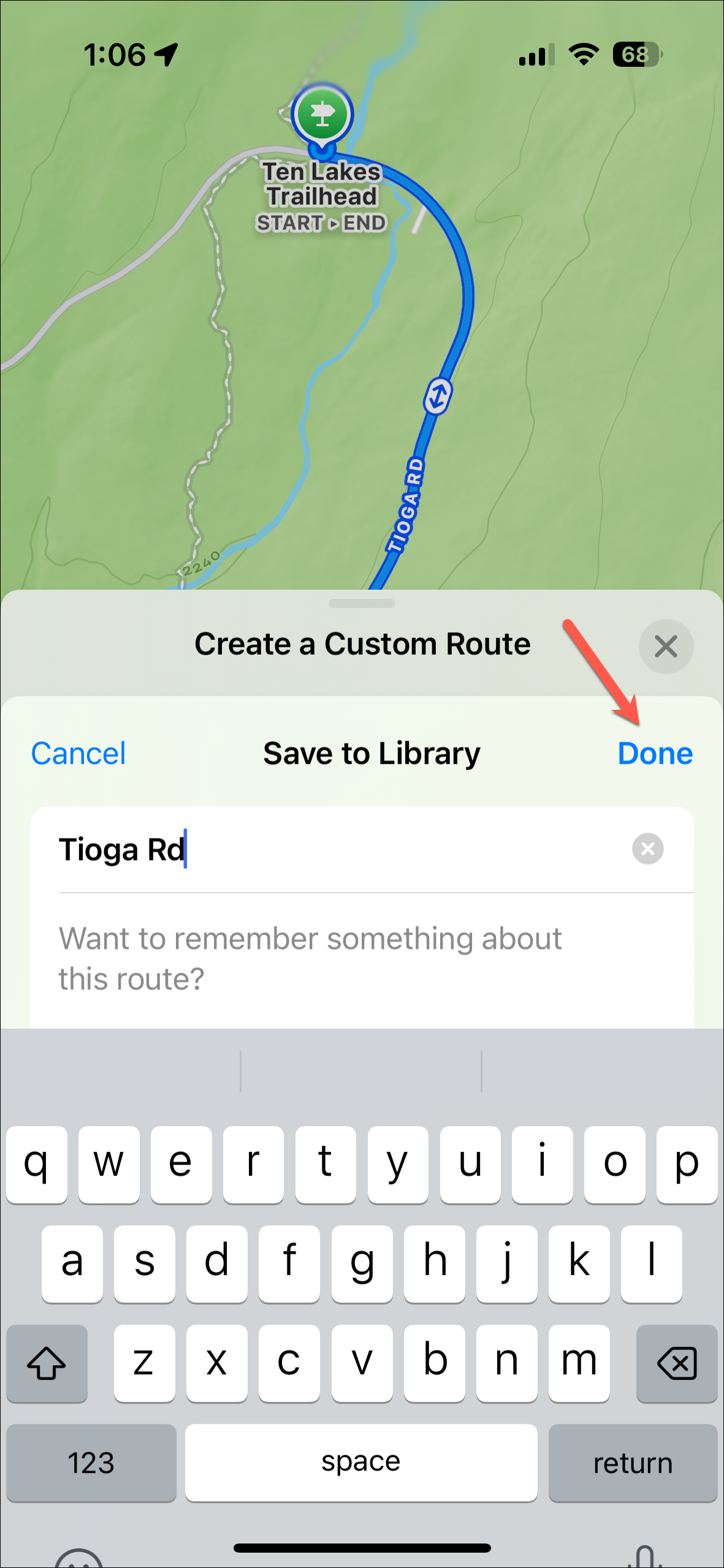 - Enter a name for the route (or use the pre-determined one) and add any notes if you want (visible only to you). In the US, you'll also have the option to save the route offline (we recommend keeping the toggle enabled). Then, tap on 'Done'.