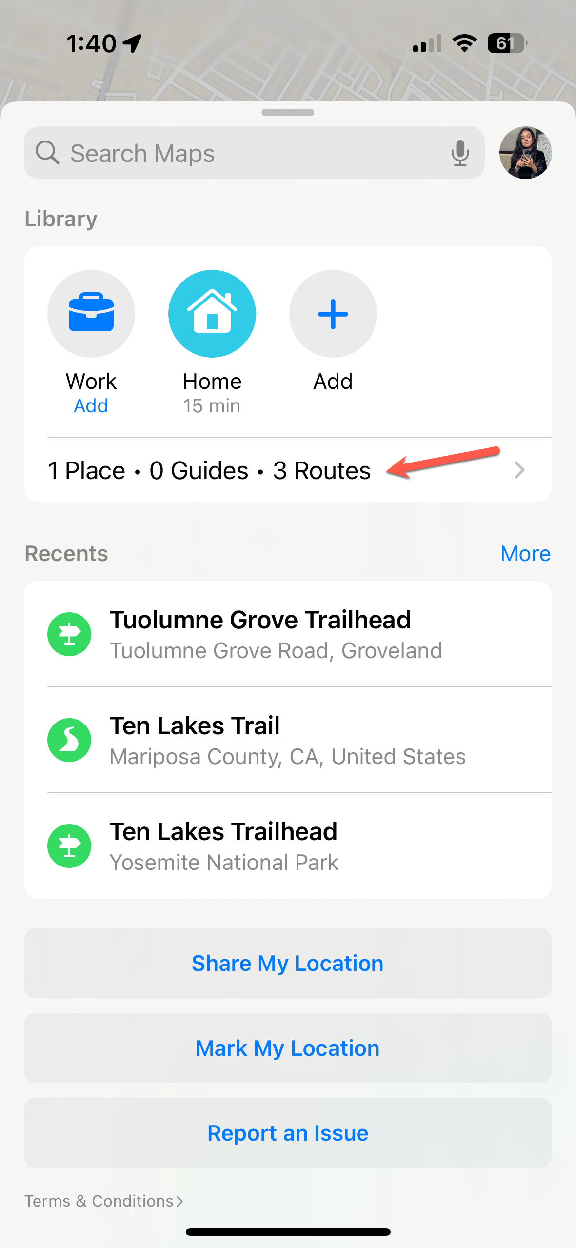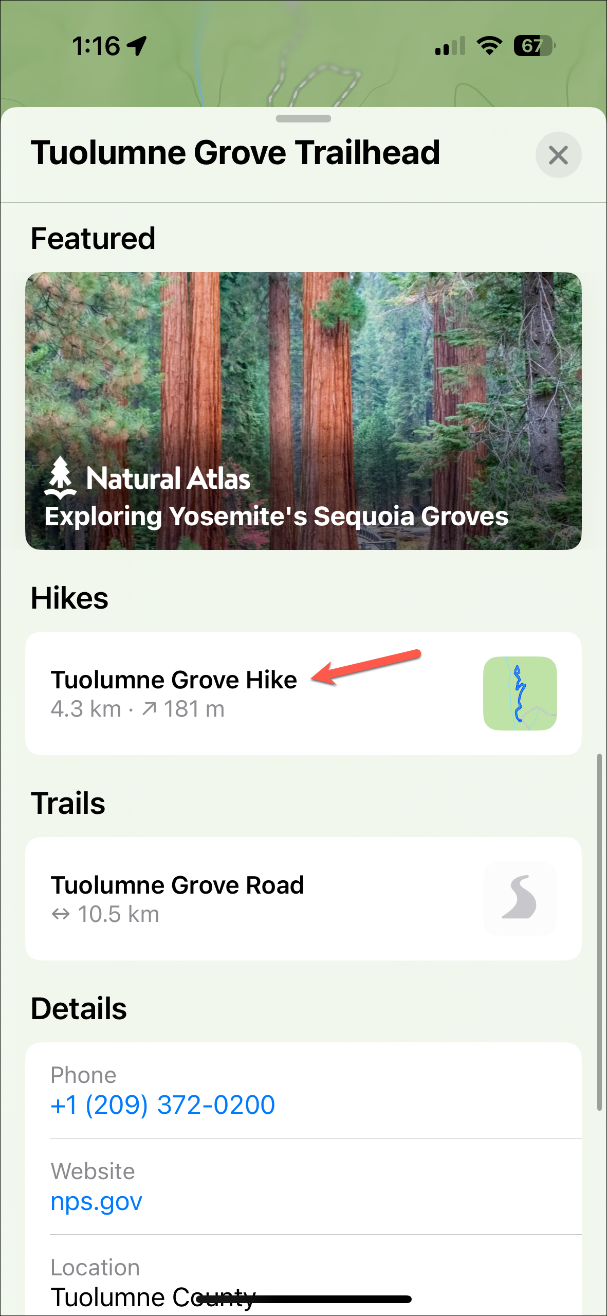 - If there's a hike already on Apple Maps, tap on it and you'll see the route for the hike and other information, such as distance, time, elevation, etc. Tap on 'Add to Library' to save it.