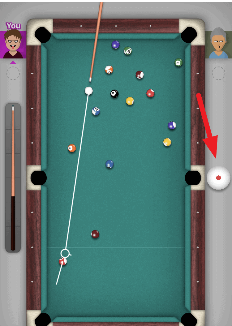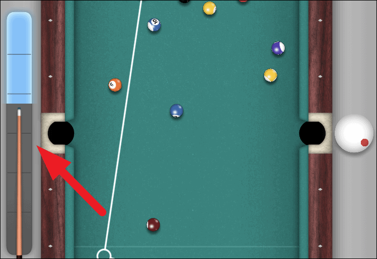 Step 10: Set the power of your shot by tapping and holding the cue stick icon on the left, then dragging downward to increase power. Release to take the shot.