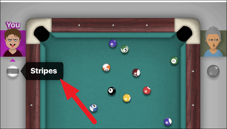 After a player successfully pockets a ball, they are assigned either stripes or solids, which is displayed under their player icon. The goal is to pocket all your assigned balls before the opponent clears theirs.
