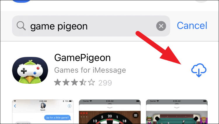 Note: If you've previously downloaded GamePigeon, the button may appear as a cloud icon with a downward arrow.