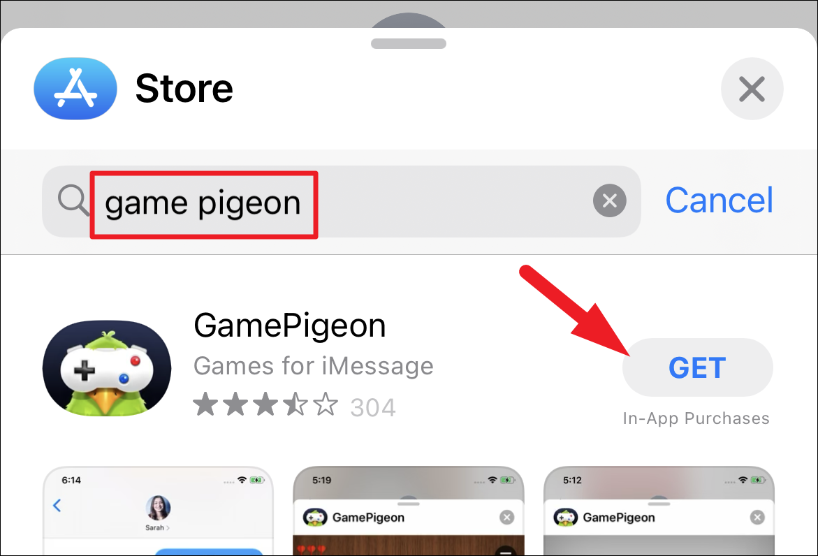 Then, locate the ‘GamePigeon’ tile and tap on the ‘Get’ or ‘cloud icon’ button to download the app on your iPhone by providing your preferred method of authentication.