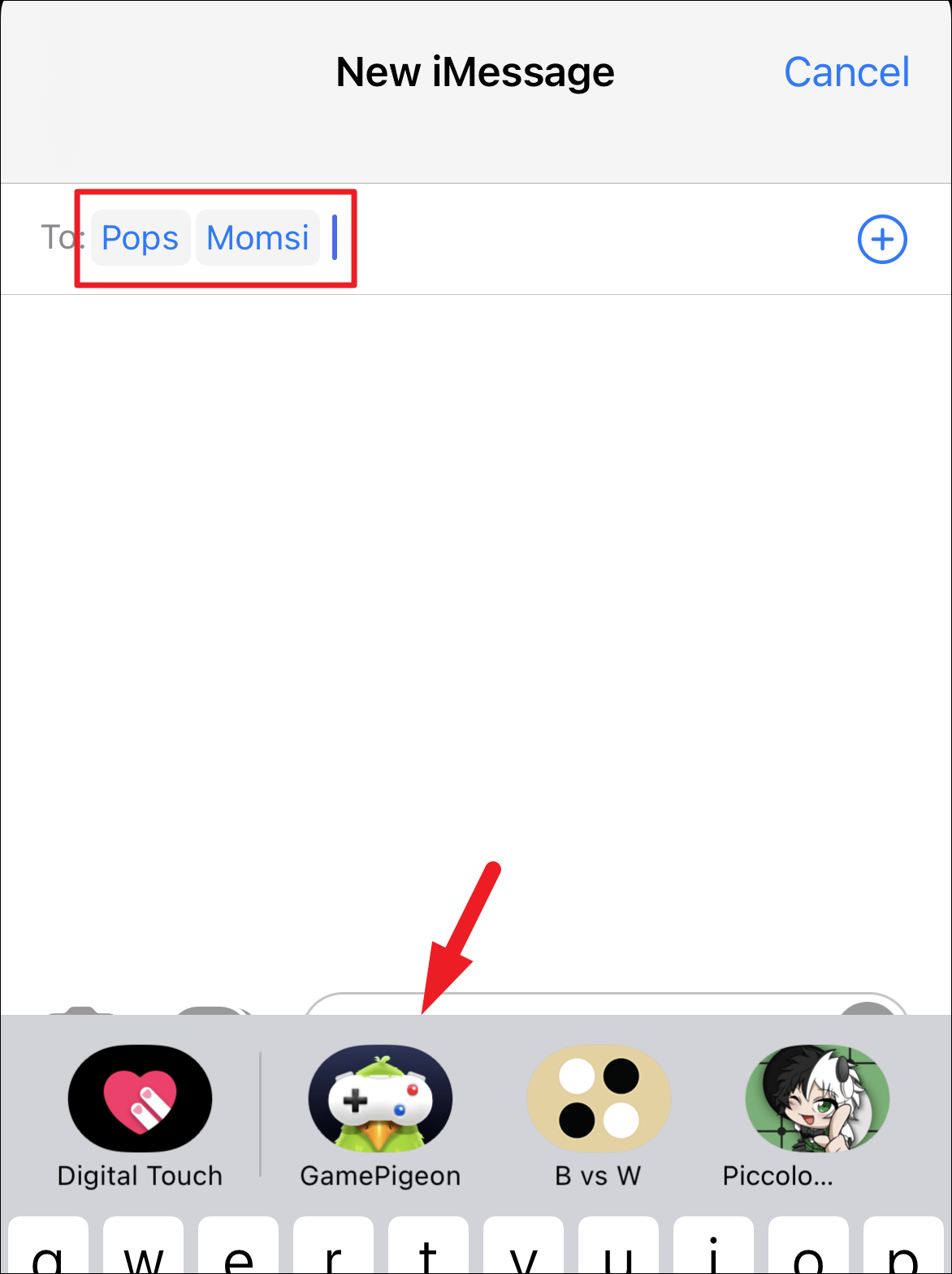 On the next screen, type or select at least two contacts and then locate and tap on the ‘GamePigeon’ icon present on the iMessage app bar situated on top of your onscreen keyboard. This will bring up an overlay window on your screen.