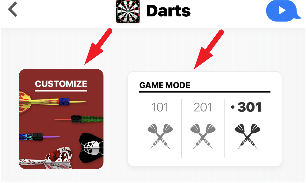 There are several modes in a darts game available on iMessage, namely – 101,201,301. The number of the mode suggests the score you start with at the starting of the game and then throw darts at different segments of the board to reduce it to zero.