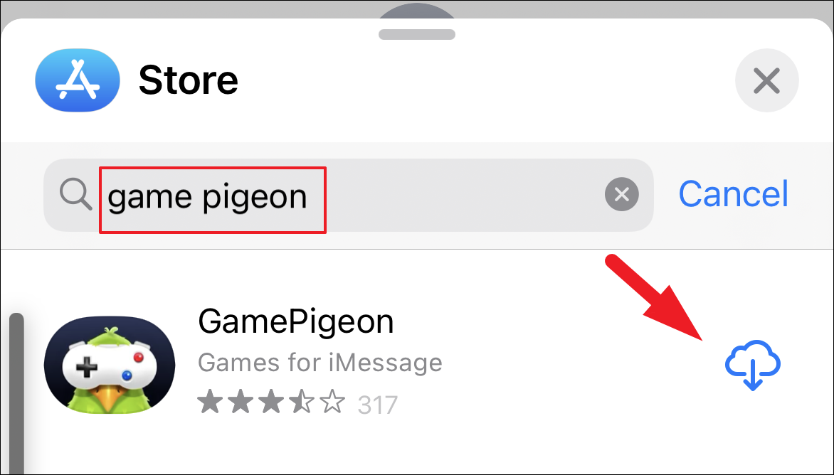 Next, from the search results, locate the ‘GamePigeon’ tile and click on the ‘Get’ or the ‘cloud icon’ button to initiate the download after providing authentication using your preferred way.